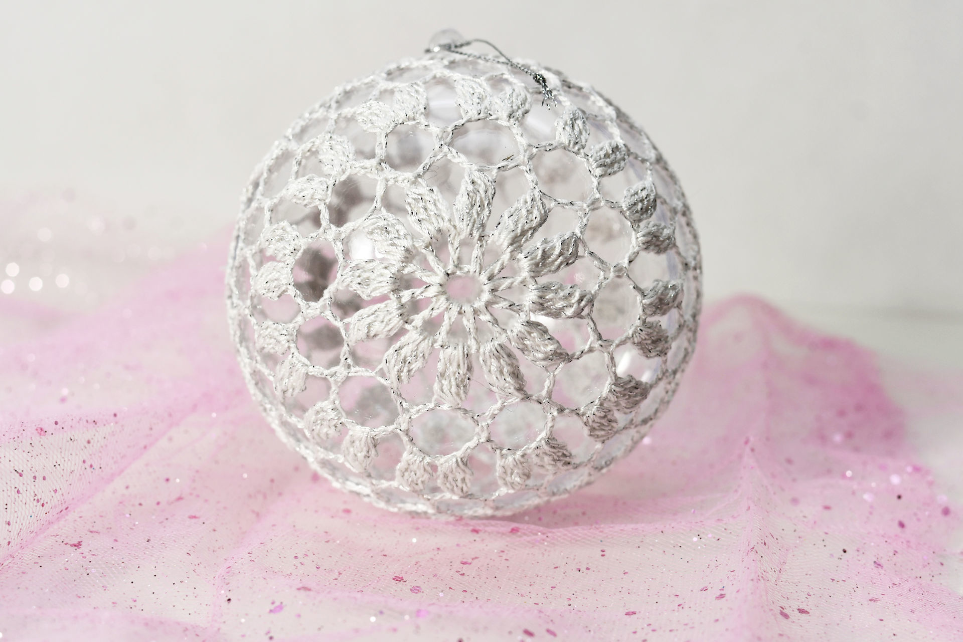 Bombka na wypełnieniu akrylowym o średnicy 10 cm, wykonana szydełkiem z połaczonych dwóch kordonków: bawełnianego Maximum i poliestrowego