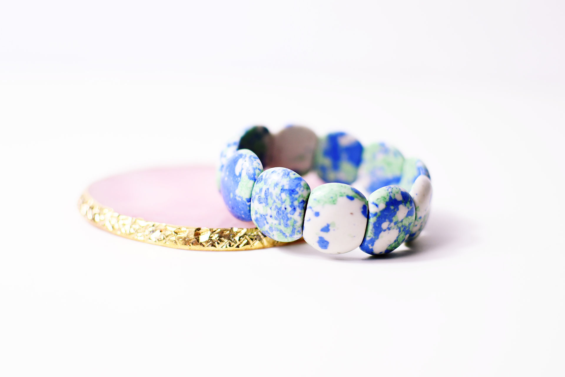 Bransoletka z muszli prasowanej, na gumkach, w kolorach kobaltowy, jasno zielony i ecru. Dostępna od ręki!