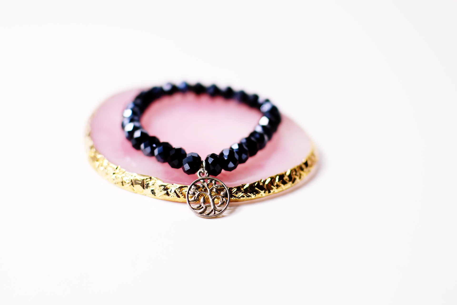 Bransoletka na silikonowej gumce, wykonana z grafitowych kryształków w kształcie fazowanych oponek średnicy ok. 8 mm z okrągłą zawieszką z motywem roślinnym ze stali chirurgicznej.