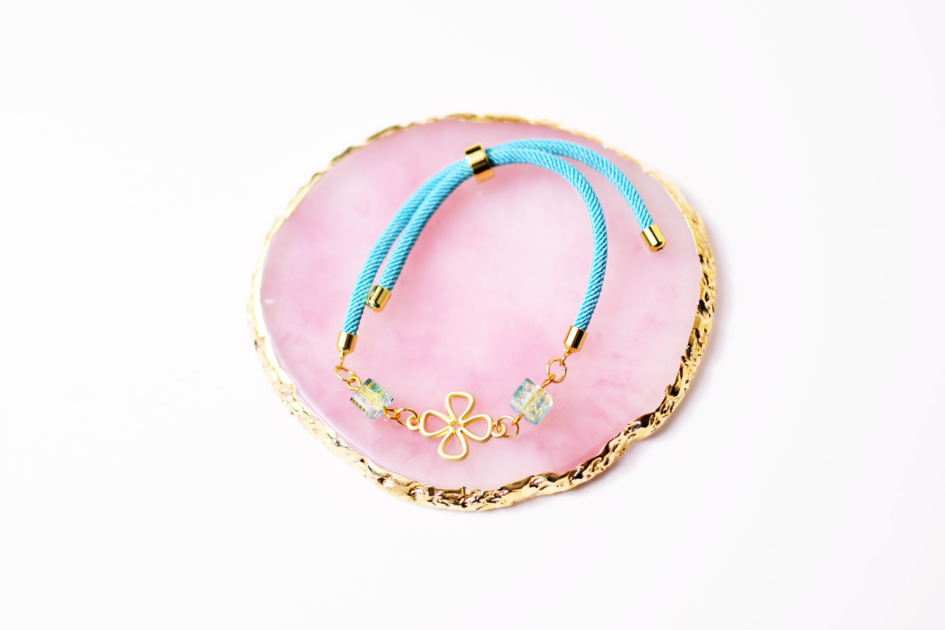 Główną ozdobą bransoletki są: ażurowy, złoty kwiat o średnicy około 2 cm oraz sześcian ze szkła weneckiego w kolorze limonkowo-turkusowym wielkości 5 mm.