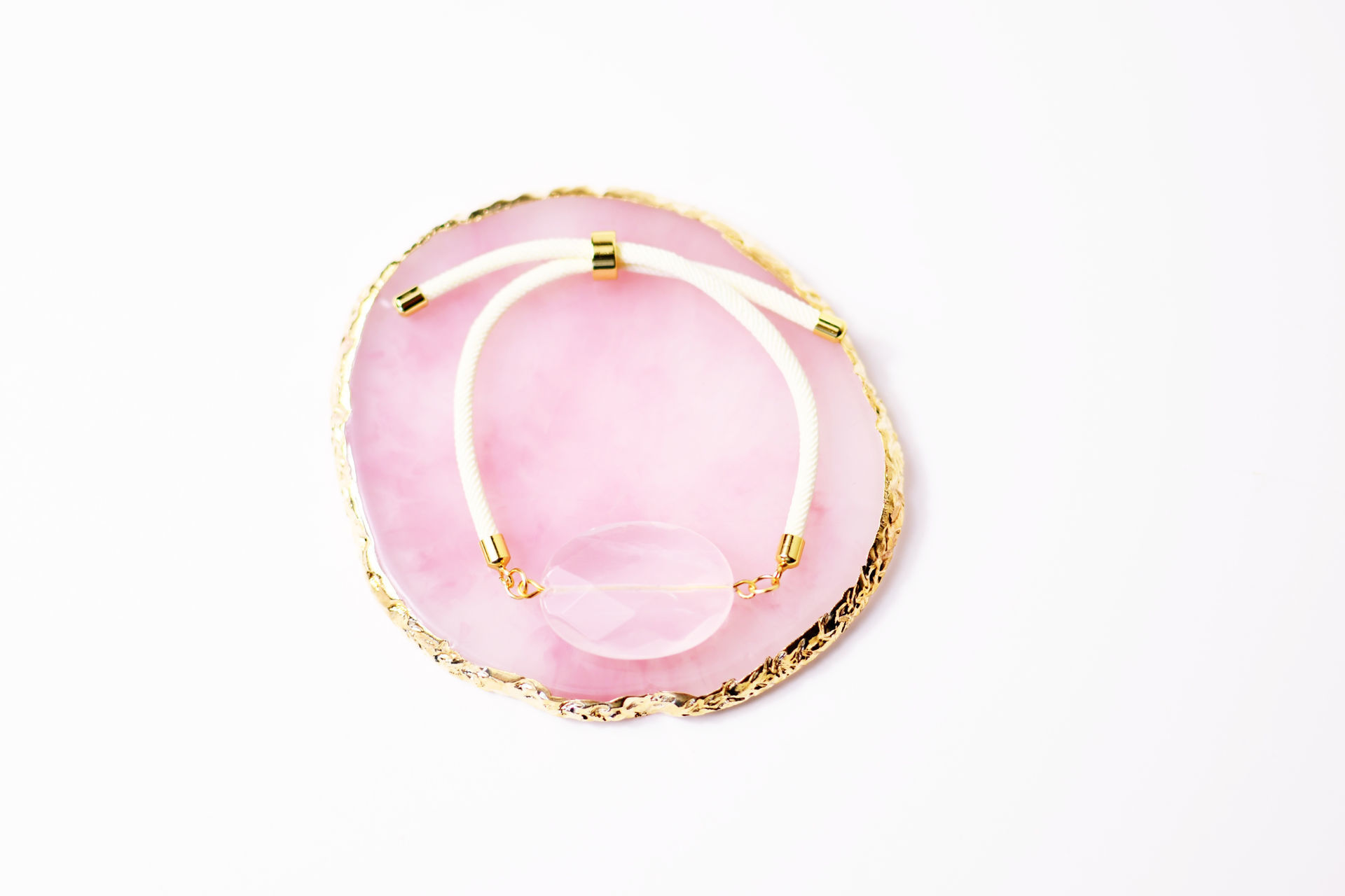 Główną ozdobą bransoletki jest różowy, fazowany, owalny kryształ górski o wymiarach: dł.: 3 cm, szer.: 2,3 cm.
