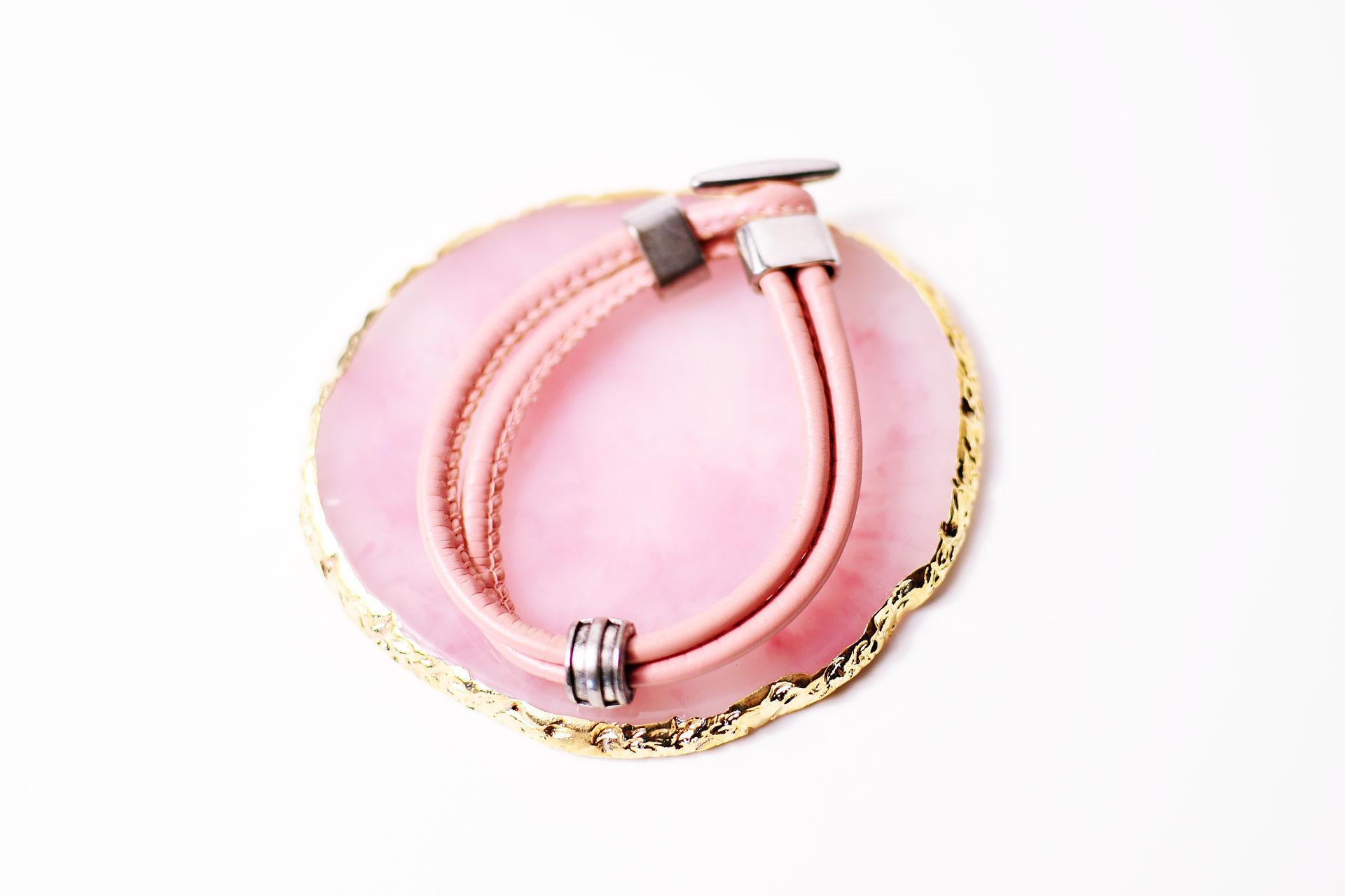 Bransoletka wykonana z dwóch rzemieni jubilerskich z przeszyciem w kolorze pudrowego różu.