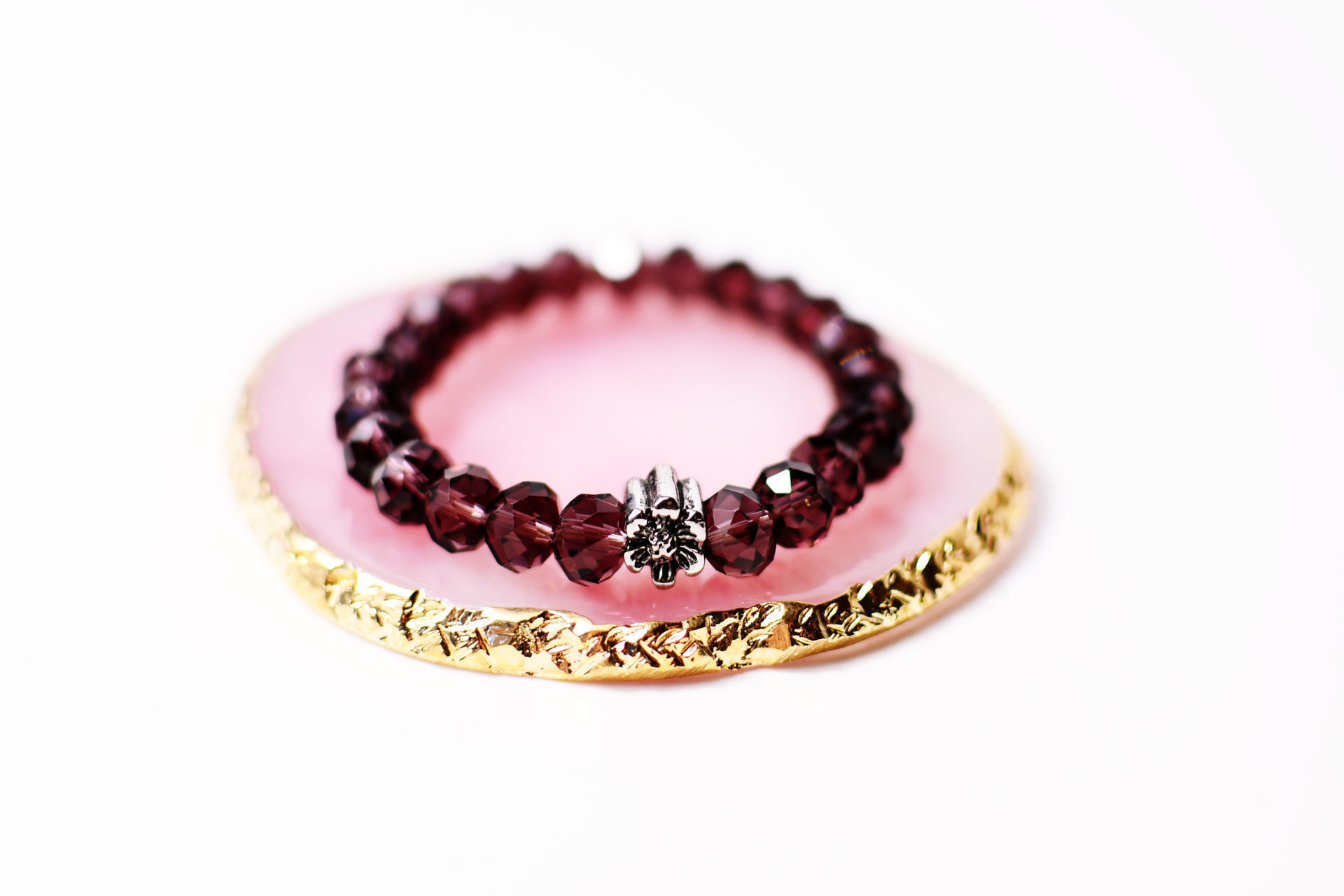 Bransoletka na silikonowej gumce, wykonana ze śliwkowych kryształków w kształcie fazowanych oponek średnicy ok. 8 mm z przekładką w kształcie kwiatka ze stali chirurgicznej.