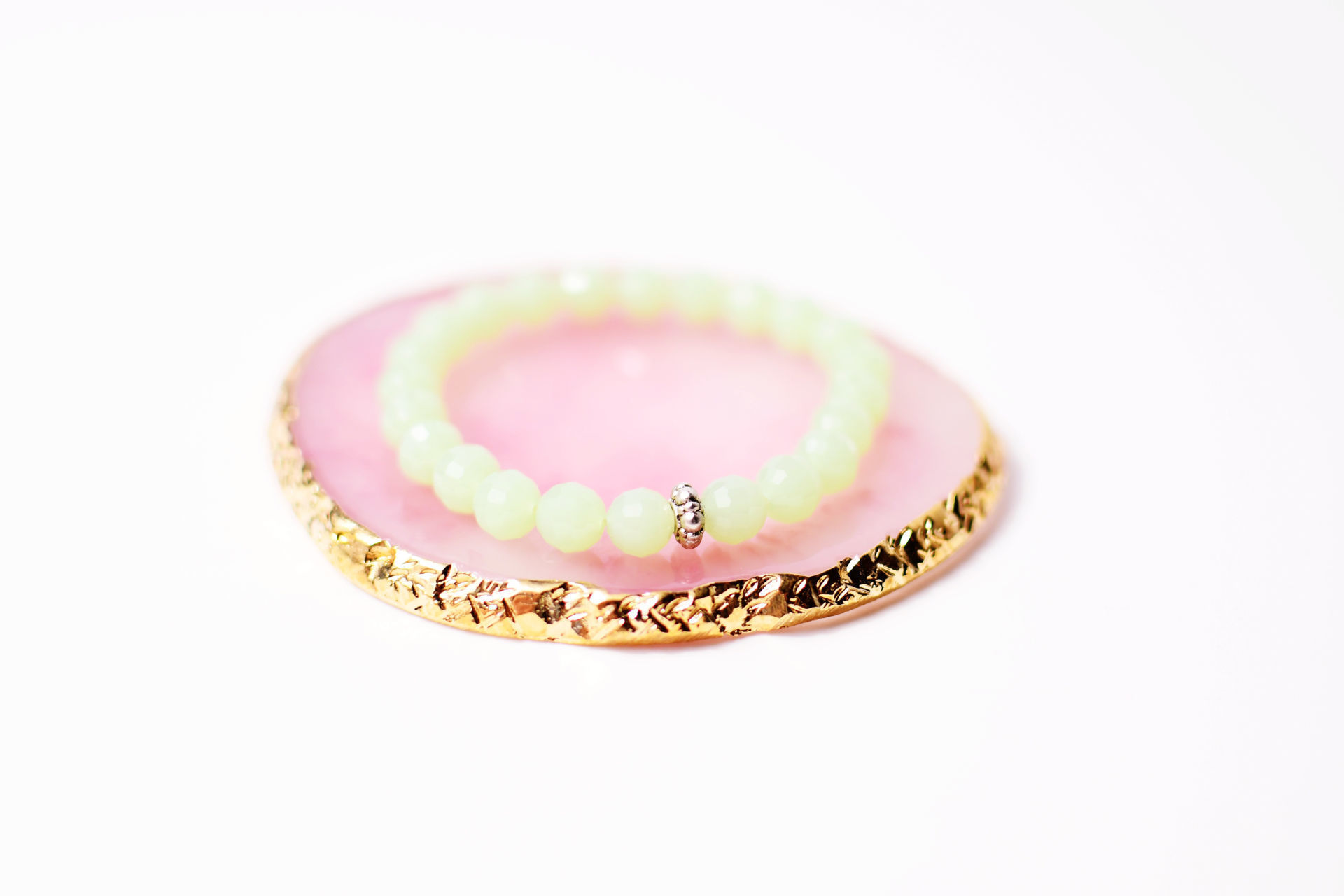 Bransoletka na silikonowej gumce, wykonana z miętowego szkła weneckiego w kształcie fazowanych kulek średnicy ok. 6 mm, całości dopełnia metalowa, ozdobna przekładka ze stali chirurgicznej.