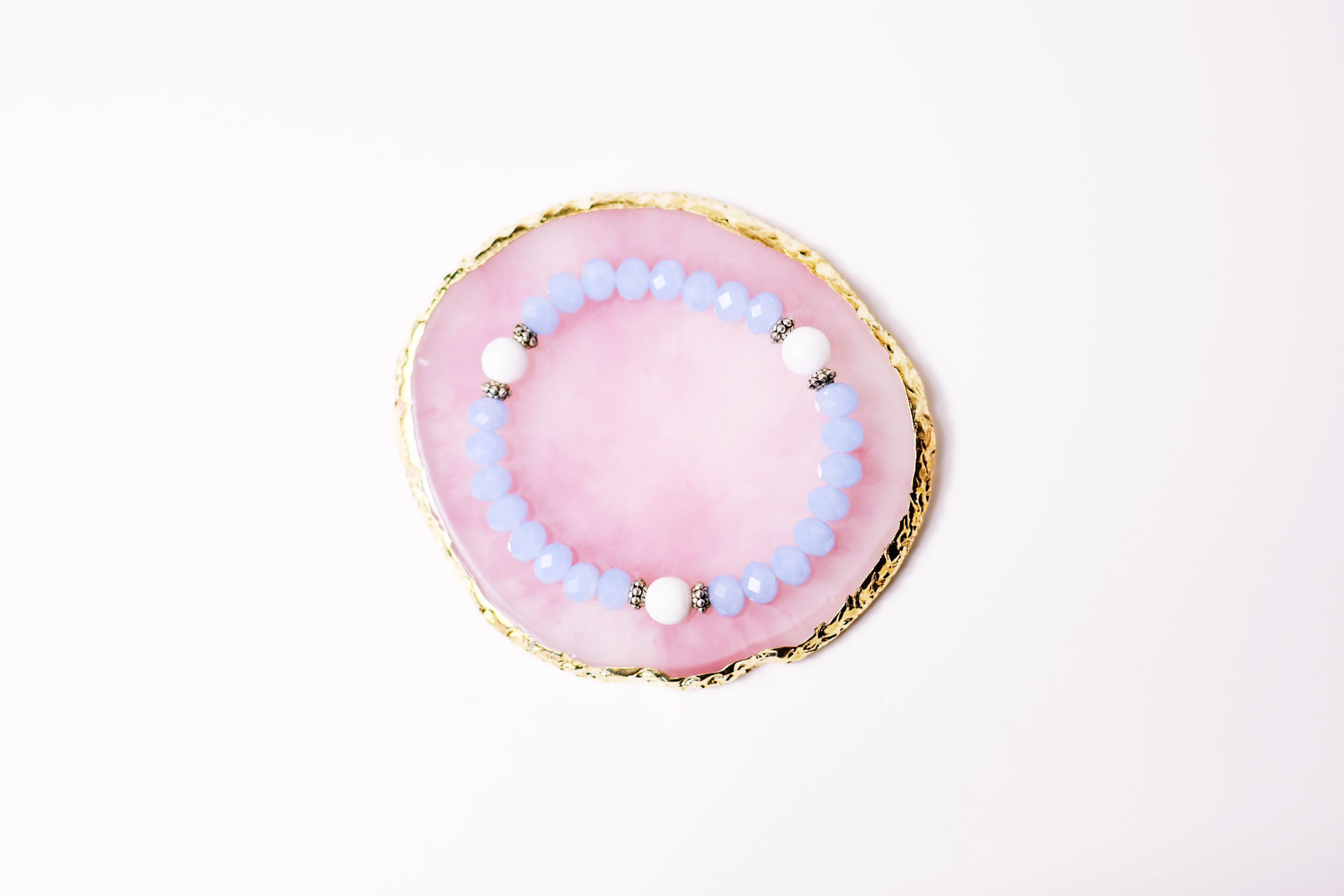Bransoletka na silikonowej gumce, wykonana z błękitnych kryształków w kształcie fazowanych oponek średnicy ok. 6 mm; białych, fazowanych kulek o średnicy 6 mm, całości dopełniają metalowe, ozdobne oponki ze stali chirurgicznej.
