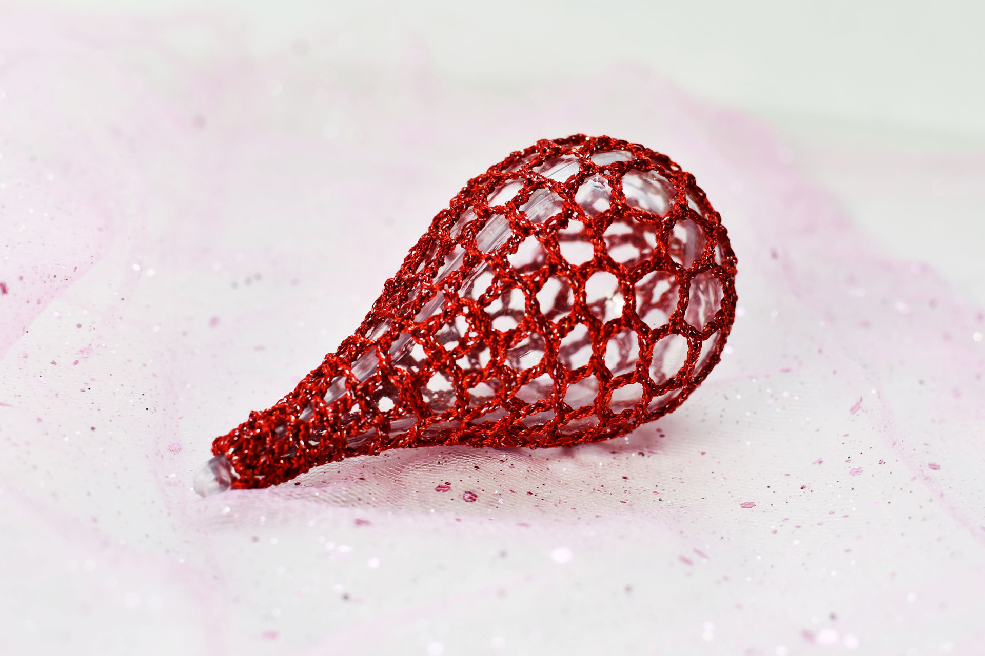 Bombka na wypełnieniu akrylowym o długości 9 cm, wykonana szydełkiem z kordonka poliestrowego YarnArt Camellia według projektu Aurelia Myszka Szara.