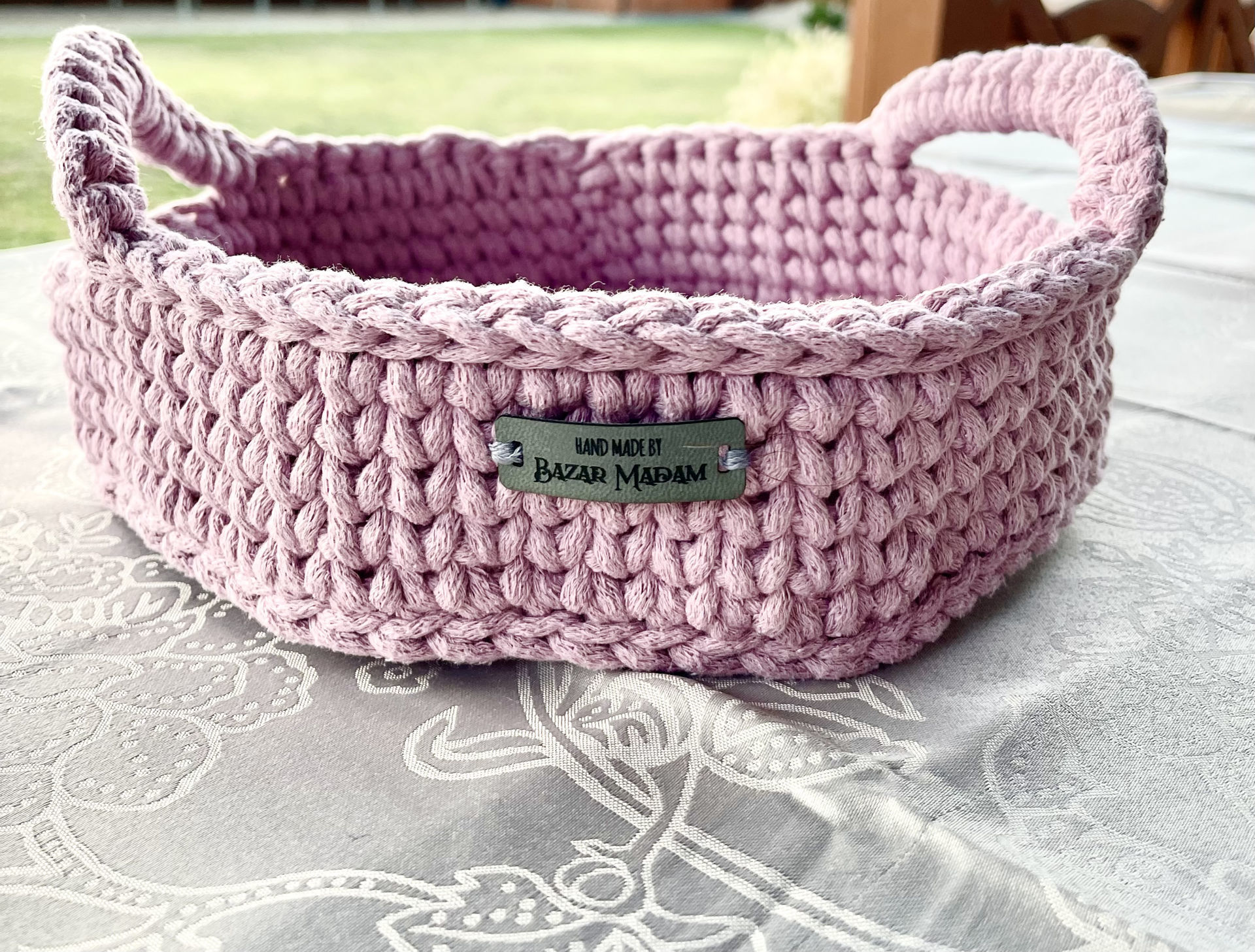 Koszyk wykonany na szydełku, ze sznurka bawełnianego 5 mm, według projektu Plotkadesign.
