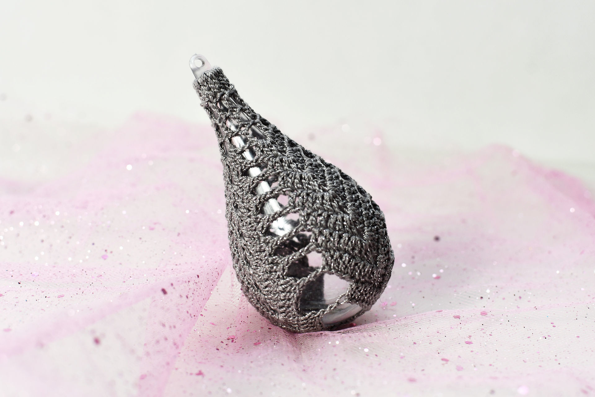 Bombka na wypełnieniu akrylowym o długości 9 cm, wykonana szydełkiem z kordonka bawełnianego Maximum Metalic według projektu Aurelia Myszka Szara.