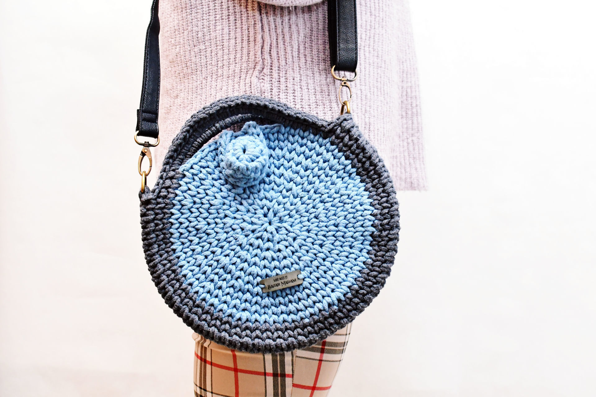 Średniej wielkości okrągła torebka ze sznurka bawełnianego w kolorze jasnego i ciemnego jeansu. Dostępna tylko na zamówienie!