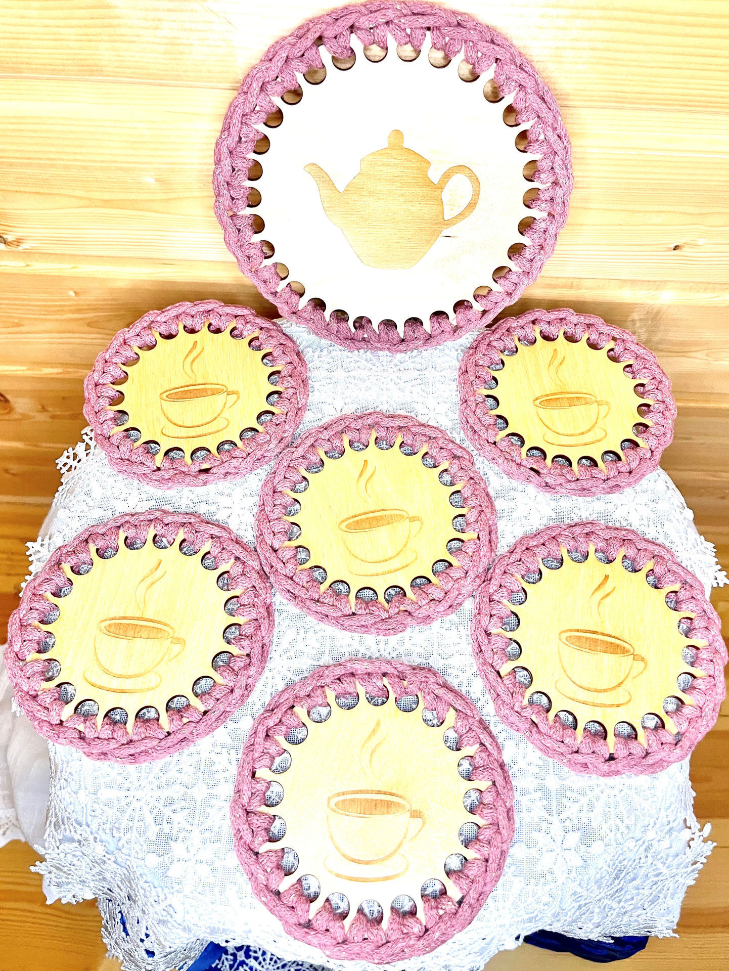 Komplet: 6 małych podkładek pod filiżanki i 1 duża pod dzbanek kawowy.