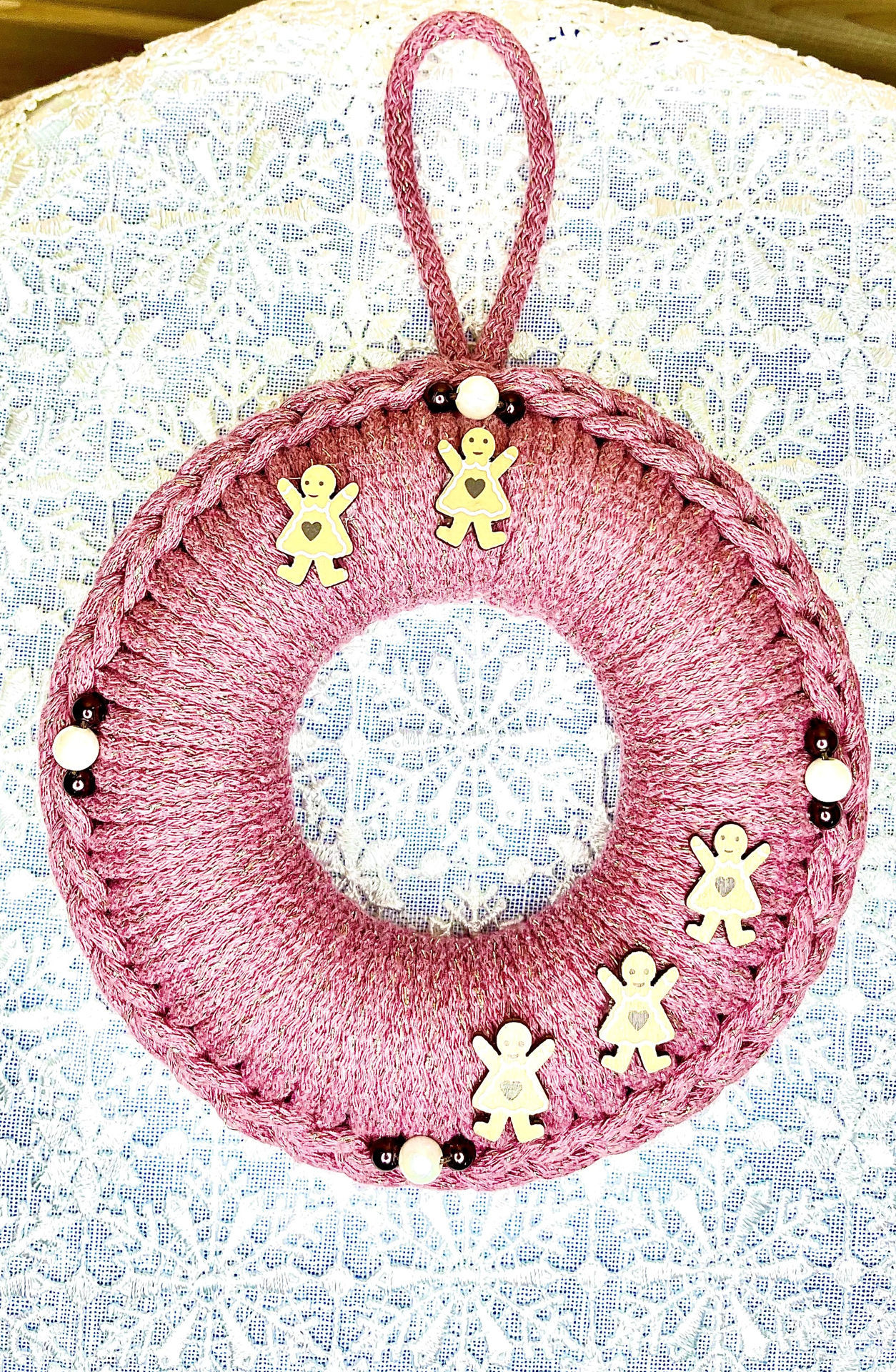 Wianek na wypełnieniu styropianowym, wykonany ze sznurka bawełnianego Glitter 5 mm według własnego projektu.