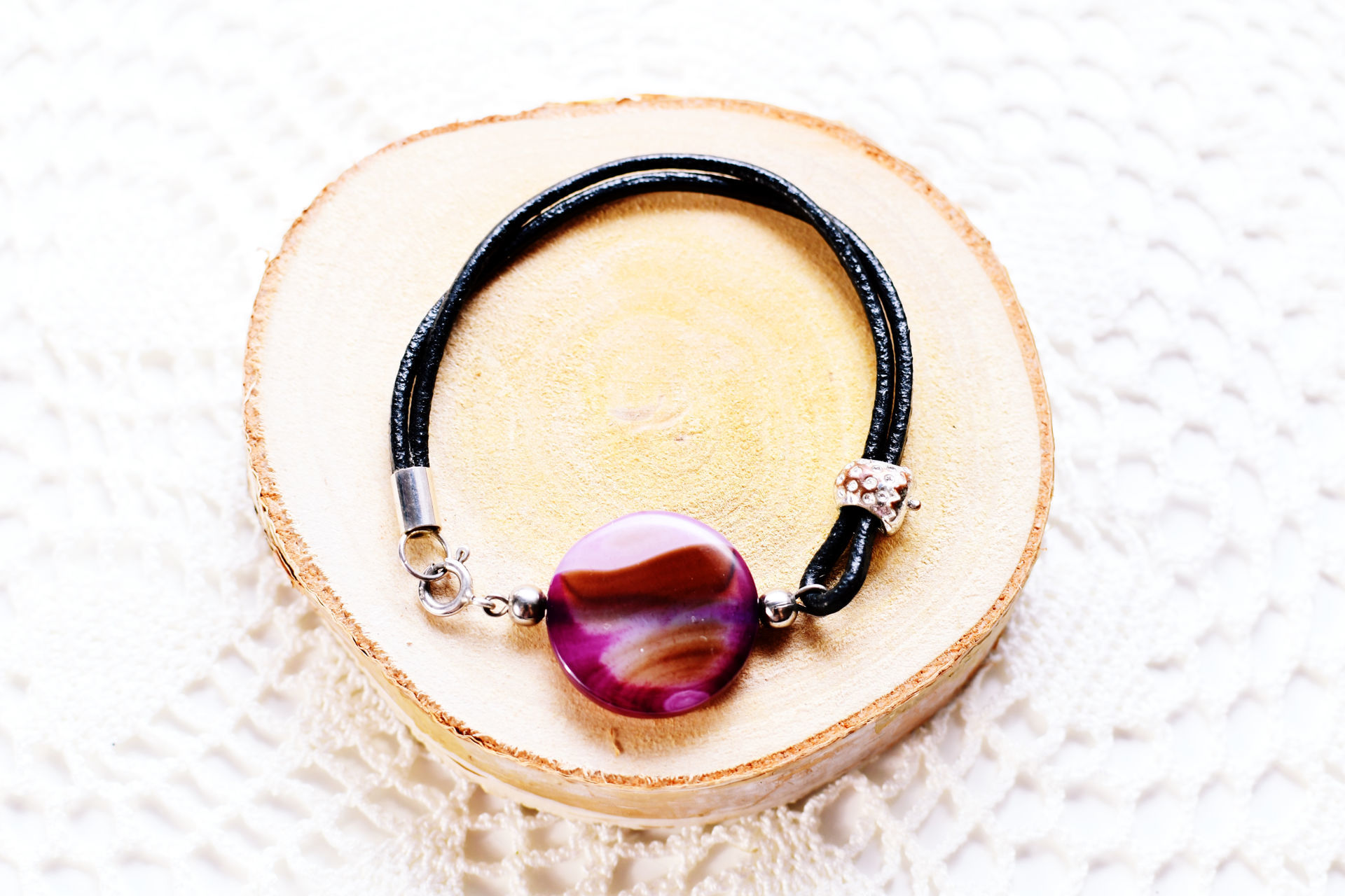 Oryginalna bransoletka z czarnego rzemienia z ametystem w kolorach bordo i fiolet. Dostępna od ręki!