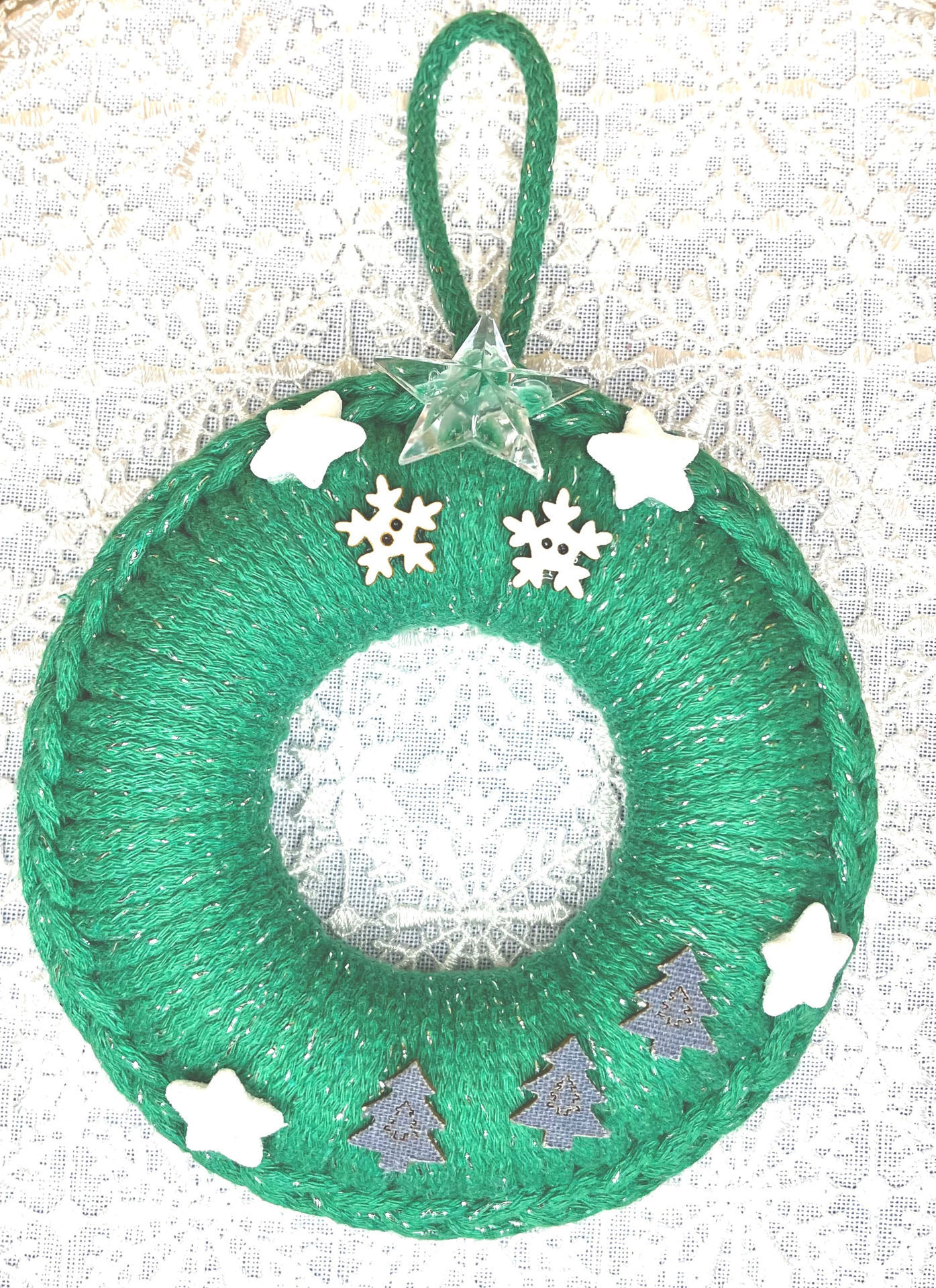 Wianek na wypełnieniu styropianowym, wykonany ze sznurka bawełnianego Glitter 5 mm według własnego projektu.